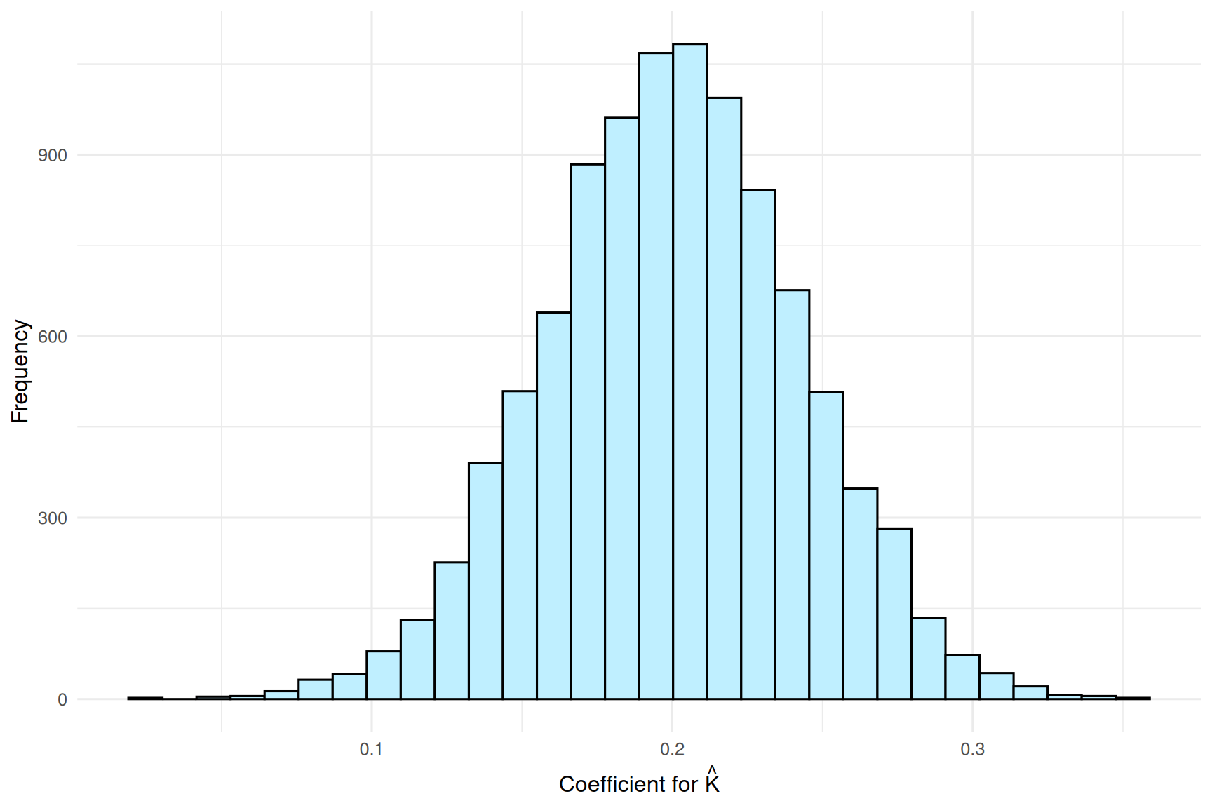 tibble::enframe(K) |>ggplot(aes(x = value)) +geom_histogram(color ="black", fill ="lightblue1") +labs(x = latex2exp::TeX("Coefficient for $\\hat{K}$"),y ="Frequency") +theme_minimal(12)