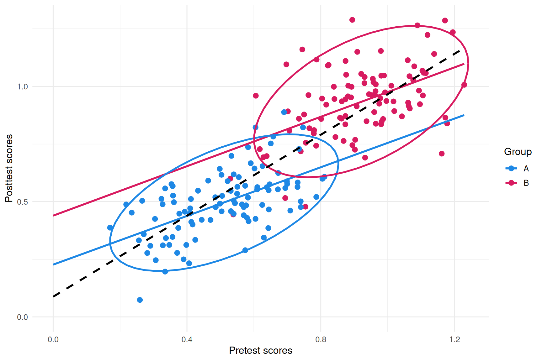 pre_post <-ggplot(sim.df) +geom_point(aes(x= pre, y = post, color=group),size =2.5) +geom_smooth(aes(x= pre, y = post, color=group),method='lm', se =FALSE, formula= y~x, fullrange=TRUE) +stat_ellipse(aes(x= pre, y = post, color=group),size =1) +labs(x ="Pretest scores",y ="Posttest scores") +scale_color_manual(name ="Group", labels =c("A", "B"), values =c("#1E88E5", "#D81B60")) +theme_minimal(12) +geom_smooth(aes(x= pre, y = post), method='lm', se =FALSE, color ="#000000",linetype ="dashed", formula= y~x, fullrange=TRUE) +xlim(0, NA) +ylim(0, NA)pre_change <-ggplot(sim.df) +geom_point(aes(x= pre, y = change, color=group),size =2.5) +geom_smooth(aes(x= pre, y = change, color=group),method='lm', se =FALSE, formula= y~x, fullrange=TRUE) +geom_smooth(aes(x= pre, y = change),method='lm', se =FALSE, formula= y~x, fullrange=TRUE) +theme_minimal(12)pre_post