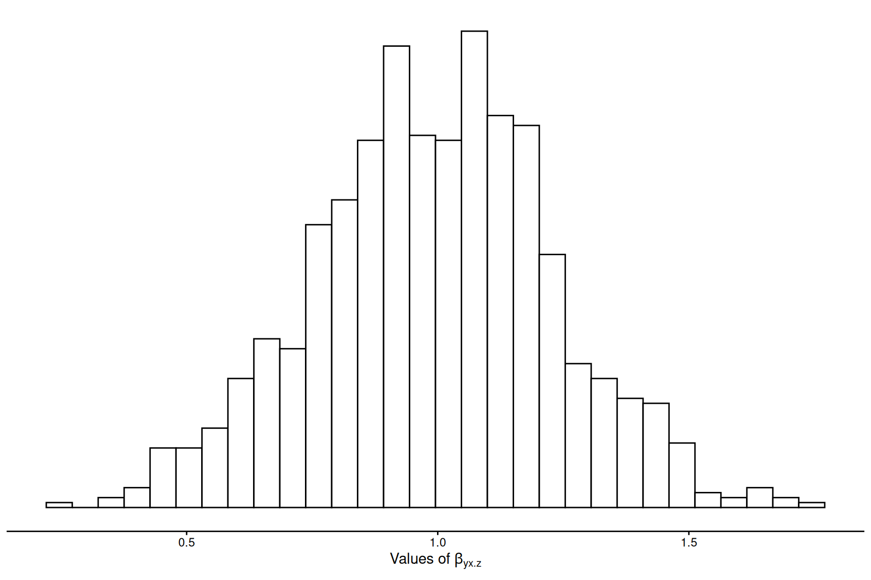 ggplot(data = coefs, aes(x = x)) +geom_histogram(color ="black", fill ="white", bins =30) +theme_classic() +theme(axis.title.y=element_blank(),axis.text.y=element_blank(),axis.ticks.y=element_blank(),axis.line.y =element_blank()) +xlab( expression(paste("Values of ", beta[yx.z])))