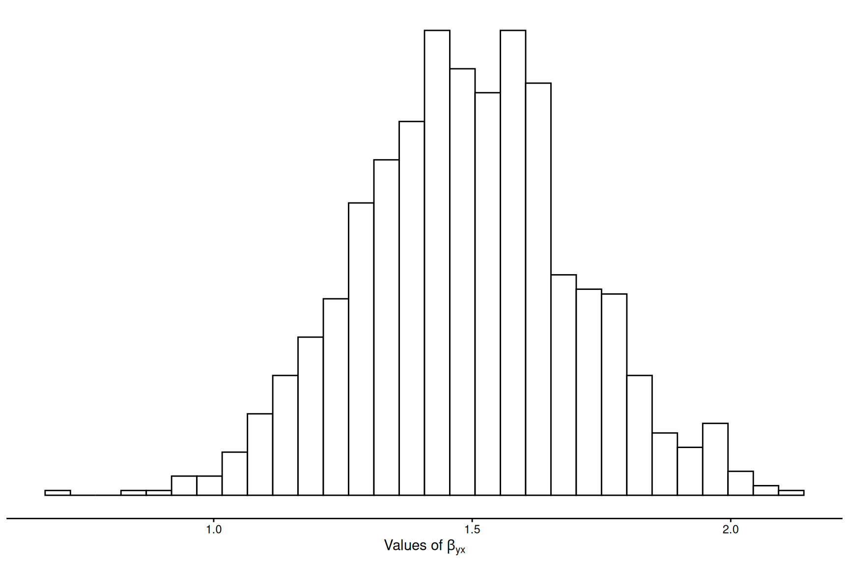 ggplot(data = coefs, aes(x = x)) +geom_histogram(color ="black", fill ="white", bins =30) +theme_classic() +theme(axis.title.y=element_blank(),axis.text.y=element_blank(),axis.ticks.y=element_blank(),axis.line.y =element_blank())+xlab( expression(paste("Values of ", beta[yx])))