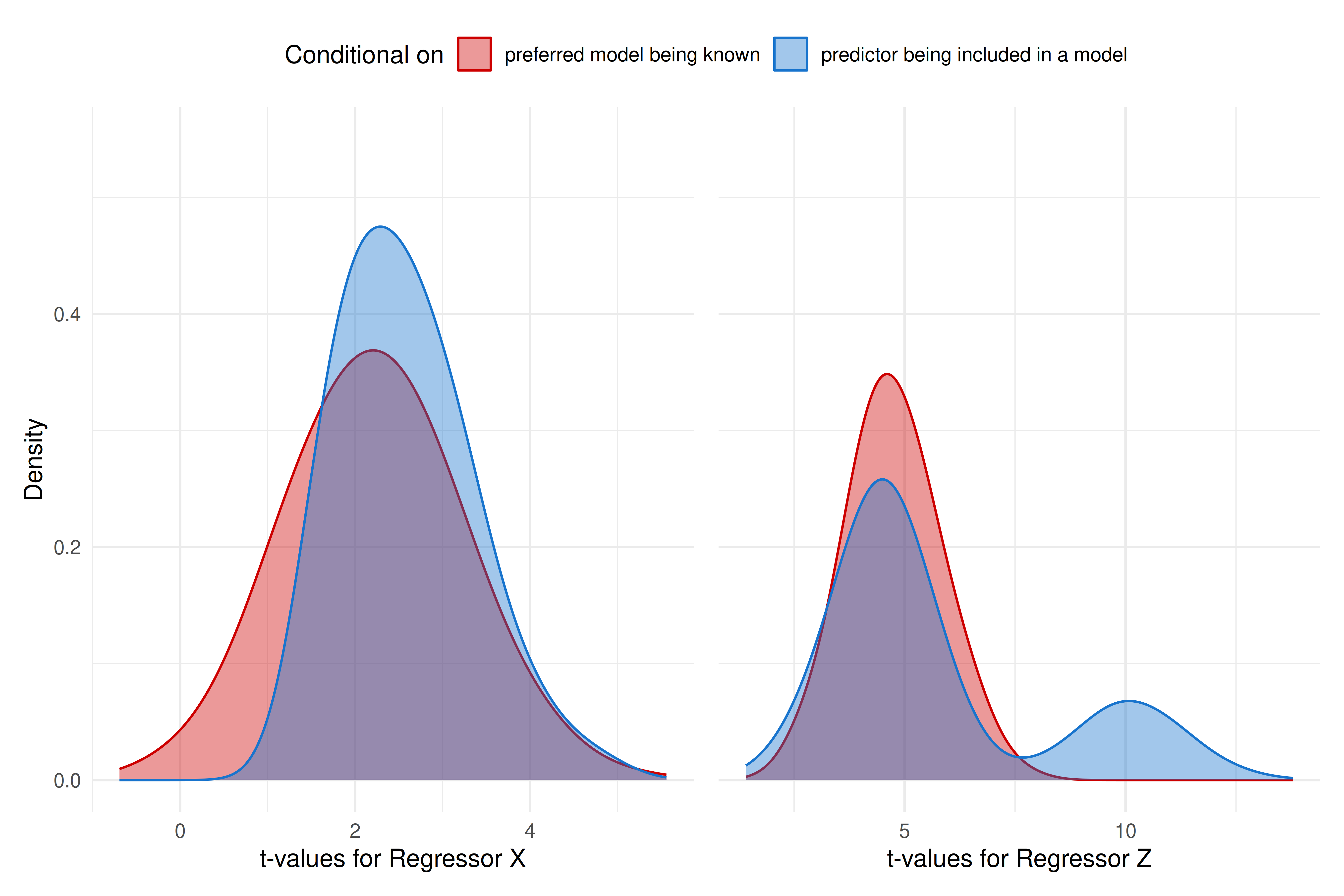 xplot <- res_df |> dplyr::filter(sim %in%c("full", "x_included")) |>ggplot(aes(x, fill = sim, color = sim)) +geom_density(adjust =2, alpha =0.4) +theme_minimal(12) +theme(legend.position ="top") +scale_y_continuous(limits =c(0, 0.55)) +labs(x ="t-values for Regressor X", y ="Density") +scale_color_manual(name ="Conditional on",labels =c("preferred model being known", "predictor being included in a model"),values =c("red3", "dodgerblue3")) +scale_fill_manual(name ="Conditional on",labels =c("preferred model being known", "predictor being included in a model"),values =c("red3", "dodgerblue3"))zplot <- res_df |> dplyr::filter(sim %in%c("full", "z_included")) |>ggplot(aes(z, fill = sim, color = sim)) +geom_density(adjust =2, alpha =0.4) +theme_minimal(12) +theme(legend.position ="none",axis.title.y =element_blank(),axis.text.y =element_blank()) +scale_y_continuous(limits =c(0, 0.55)) +labs(x ="t-values for Regressor Z", y ="Density") +scale_color_manual(values =c("red3", "dodgerblue3")) +scale_fill_manual(values =c("red3", "dodgerblue3")) +guides(fill="none", color ="none")xplot + zplot +plot_layout(guides ='collect') &theme(legend.position='top')