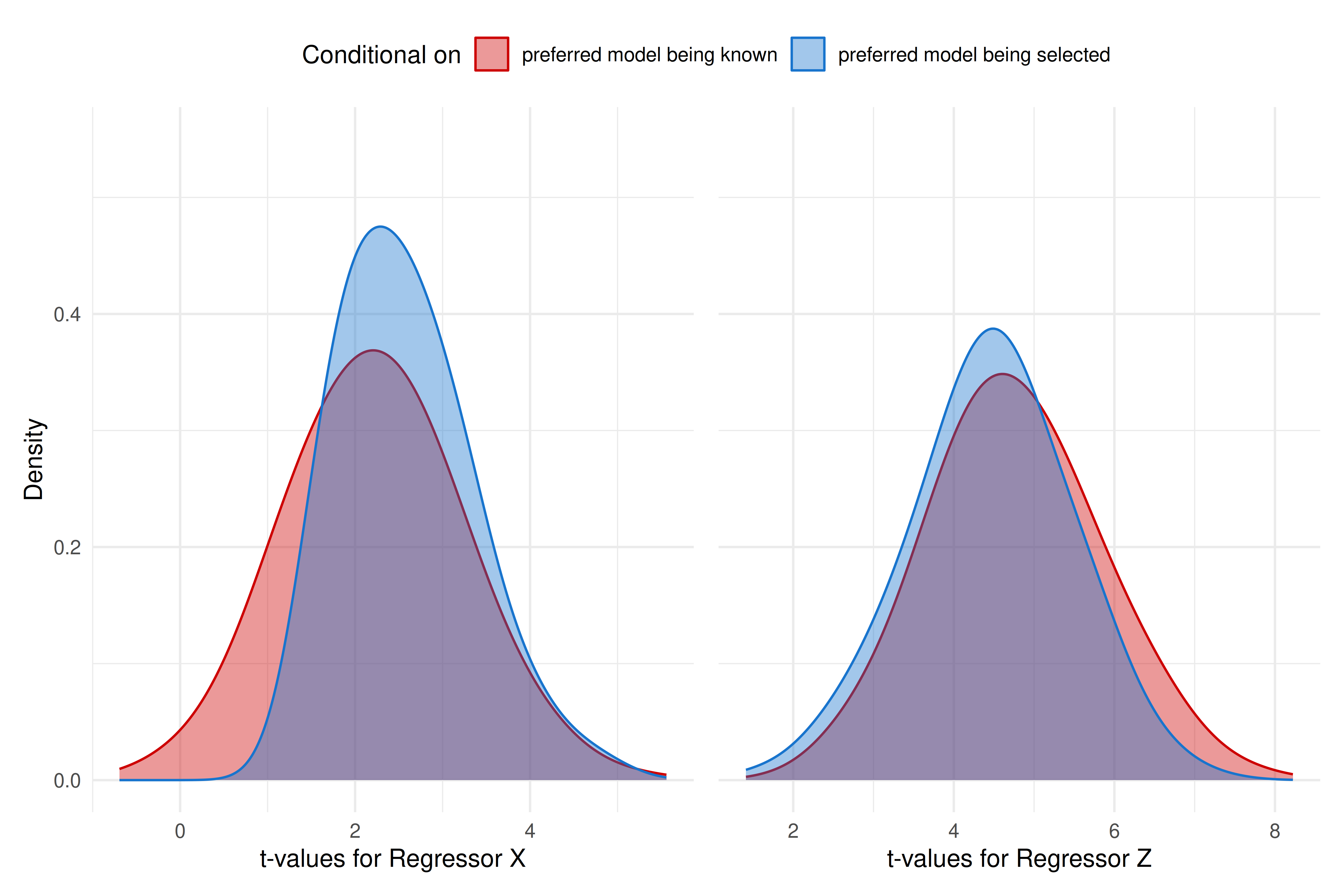 xpref_plot <- res_df |> dplyr::filter(sim %in%c("full", "pref")) |>ggplot(aes(x, fill = sim, color = sim)) +geom_density(adjust =2, alpha =0.4) +theme_minimal(12) +theme(legend.position ="top") +scale_y_continuous(limits =c(0, 0.55)) +labs(x ="t-values for Regressor X", y ="Density") +scale_color_manual(name ="Conditional on",labels =c("preferred model being known", "preferred model being selected"),values =c("red3", "dodgerblue3")) +scale_fill_manual(name ="Conditional on",labels =c("preferred model being known", "preferred model being selected"),values =c("red3", "dodgerblue3"))zpref_plot <- res_df |> dplyr::filter(sim %in%c("full", "pref")) |>ggplot(aes(z, fill = sim, color = sim)) +geom_density(adjust =2, alpha =0.4) +theme_minimal(12) +theme(legend.position ="none",axis.title.y =element_blank(),axis.text.y =element_blank()) +scale_y_continuous(limits =c(0, 0.55)) +scale_color_manual(values =c("red3", "dodgerblue3")) +scale_fill_manual(values =c("red3", "dodgerblue3")) +labs(x ="t-values for Regressor Z") +guides(fill="none", color ="none")xpref_plot + zpref_plot +plot_layout(guides ='collect') &theme(legend.position='top')