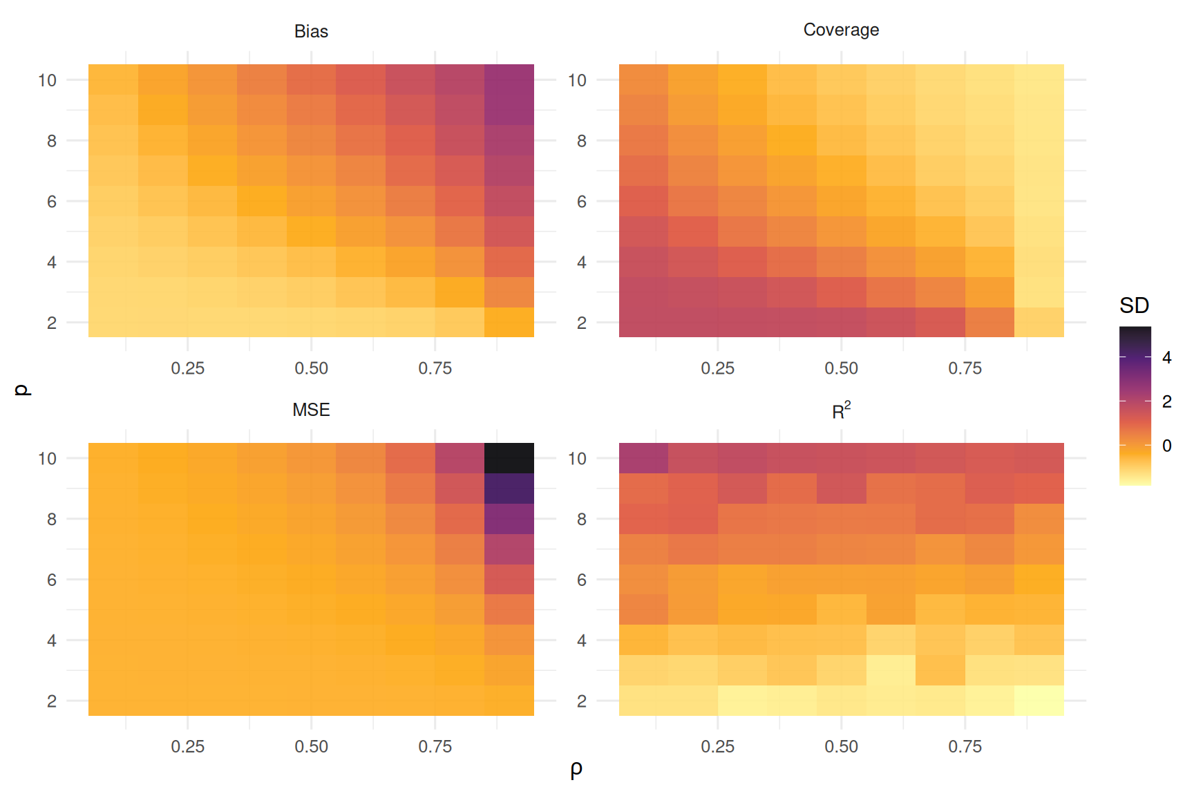 #| fig-cap: "Standardized measures of Bias, Coverage, Mean Square Error (MSE) and R2, across each simulation of pairs of number of predictors and correlation values"#| message: false#| dpi: 300simdfplot <- simdf |> dplyr::group_by(cor, npred) |> dplyr::summarise(coverage =mean(coverage),estimate =mean(estimate),bias =mean(bias),mse =mean(mse),rsq =mean(rsq)) |> dplyr::ungroup()simdfplot |> dplyr::mutate(dplyr::across(c("coverage", "bias", "mse", "rsq"), scale)) |> tidyr::pivot_longer(cols =c(coverage, bias, mse, rsq), names_to ="measure", values_to ='value') |> dplyr::mutate(measure = dplyr::recode(measure, "coverage"="Coverage", "bias"="Bias", "mse"="MSE", "rsq"="R^2")) |>ggplot() +aes(x = cor, y = npred, fill = value) +geom_tile() +scale_fill_viridis_c(direction =-1, option ="inferno", alpha = .9) +scale_y_continuous(breaks =c(2, 4, 6, 8, 10)) +labs(x = latex2exp::TeX("$\\rho$"), y ="p", fill ="SD") +theme_minimal(12) +facet_wrap(~measure, scales ="free",labeller = label_parsed)
